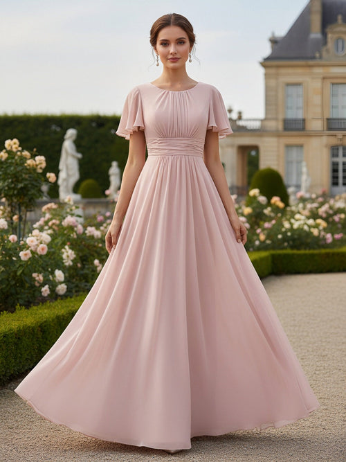A Line Crew Neck Short Sleeves Pleated Long Bridesmaid Dresses